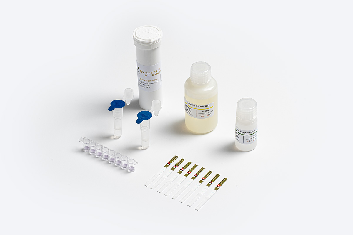 Symmetric B1 Green is a lateral flow test for the quantitative detection of Aflatoxin B1 (AFB1) in grains, cereals, and nuts. It uses water-based extraction instead of traditional organic solvents and comes in a convenient strip format.