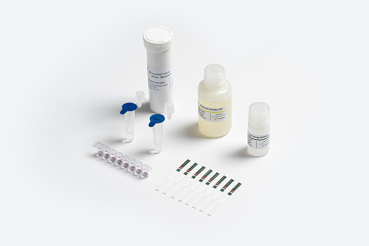 Symmetric ZON Green is a lateral flow test for the quantitative detection of Zearalenone (ZON) in grains and cereals. It uses a water-based extraction method instead of traditional organic solvents and comes in a convenient strip format.